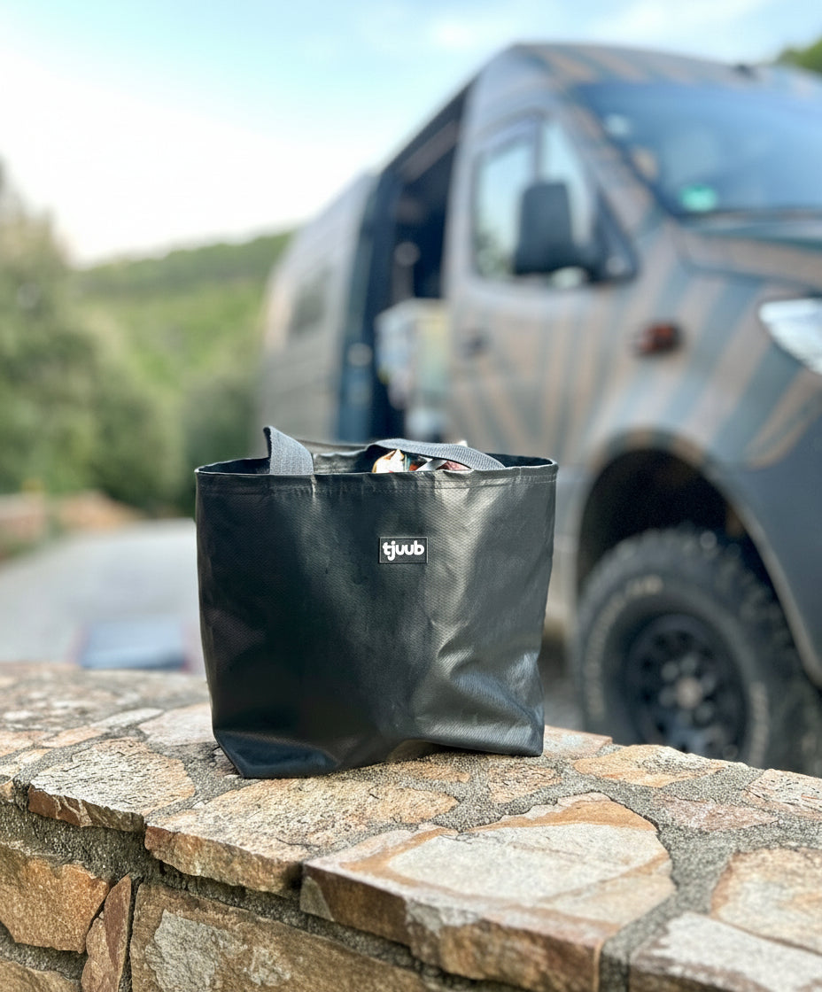 Diese schwarze Tasche aus Plane ist das Ordnungssystem, das du im Camper benötigst. Sie ist flexibel, steht stabil und verträgt Regen, Dreck und tägliche Nutzung. Perfekt für Menschen, die unterwegs leben, reisen oder einfach eine haltbare, funktionale Tasche suchen.