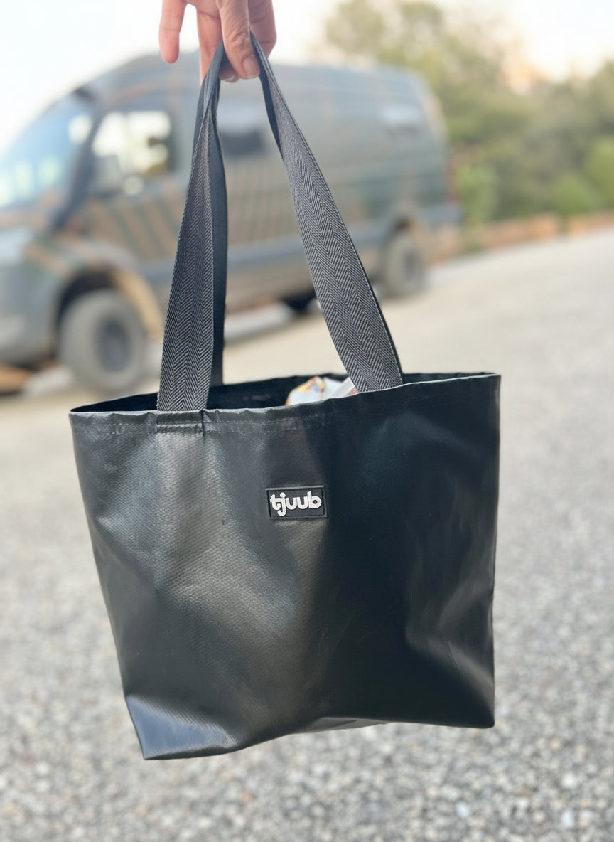 Schwarze Tasche aus Plane. Robust. Leicht. Ordnung im Van.
